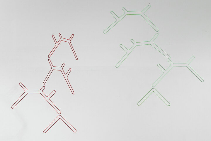 「知恵の輪」あそびのように接続点の組み合わせをかえることで、まったく違う形状のモビールをつくることができます。